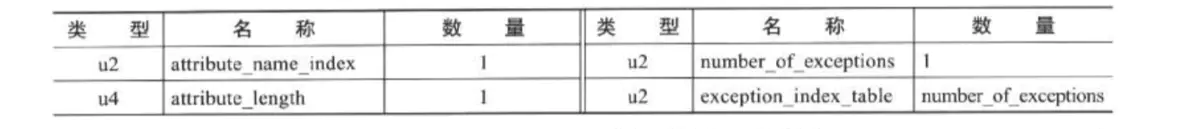 与前面异常不一样,Exceptions属性的作用是列举出方法中可能抛出的受检查异常。也就是方法描述时在throws关键字后面列举的异常。结构如下表: