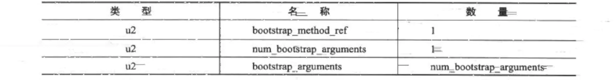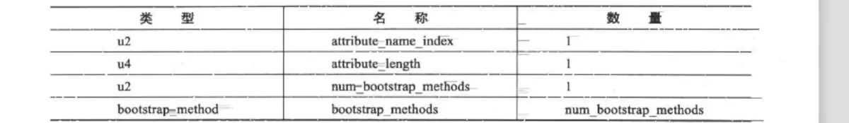 在JDK1.7发布后增加到了Class文件规范中,它是一个复杂的变长属性,位于类文件的属性表中,它保存了invokedynamic指令引用的引导方法限定符。结构表如下: