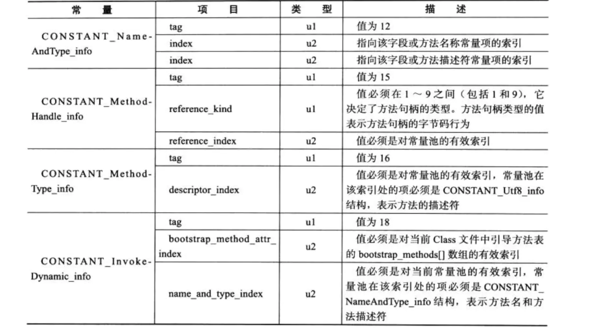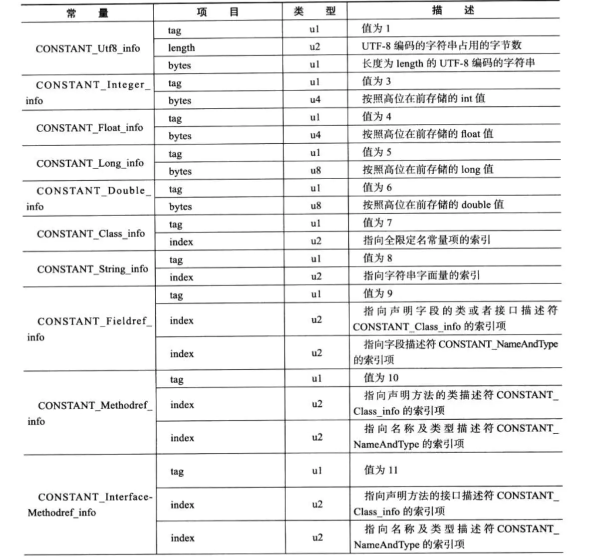 常量池中每一项常量都是一个表。1.7之前是11种,1.7及以后为了更好的支持动态语言调用,额外增加了3中(CONSTANT_MethodHandle_info、CONSTANT_MethodType_info、CONSTANT_InvokeDynamic_info)。