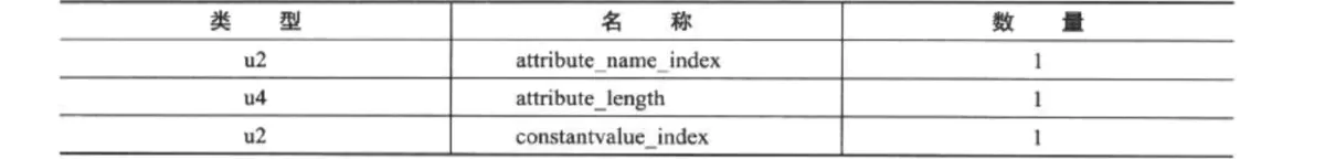 作用是通知虚拟机自动为静态变量赋值。对于非static类型的变量的赋值是在实例构造器<init>方法中进行的;而对于类变量,有两种方式:1.在类构造器<clinit>方法中;2.使用ConstantValue属性。结构表如下: