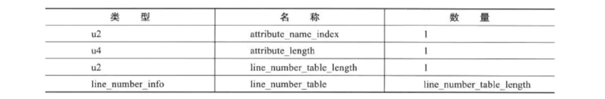 它用于描述Java源码行号与字节码行号(字节码的偏移量)之间的对应关系。可以在Javac中分别使用-g:none或-g:lines选项来取消或要求生成这项信息。如果取消生成,程序运行产生异常时,堆栈中不会显示出错的行号;调试的时候也无法按照源码行设置断点。结构如下: