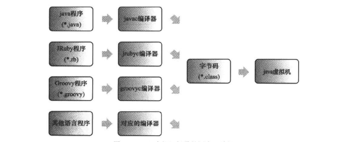 实现语言无关性的基础是虚拟机和字节码存储格式。Java虚拟机不和任何语言绑定,它只与"class文件"这种特定的二进制文件格式所关联。如下图所示: