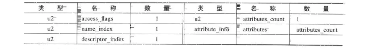 方法表和字段表描述很相似,数据项目含义仅在访问标志和属性表集合的可选项中有所区别,如下图所示: