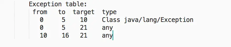 异常表实际上是Java代码的一部分,编译器使用异常表而不是简单的跳转命令来实现Java异常及finally处理机制。