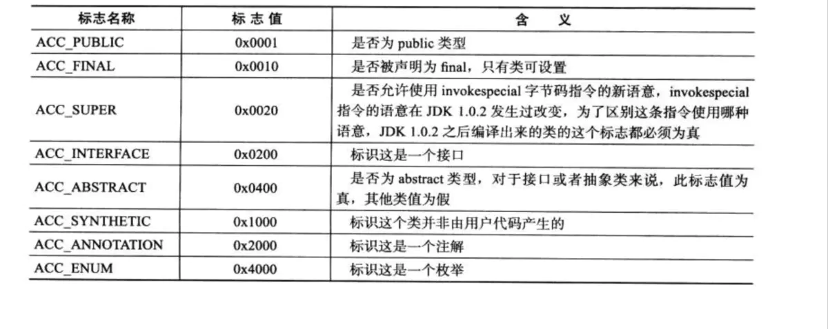 常量池结束后,紧接着是2个字节的访问标志,用于识别一些类或者接口层次的访问信息:这个Class是类还是接口;是否定义为public;是否声明为final等。具体标志为如下图:
