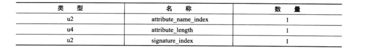 JDK1.5后增加到Class文件规范中,它是一个可选的定长属性,可以出现在类、属性表和方法表结构的属性表中。任何类、接口、初始化方法或成员的泛型签名如果包含了类型变量或参数化类型,则Signature属性会为它记录泛型签名信息。