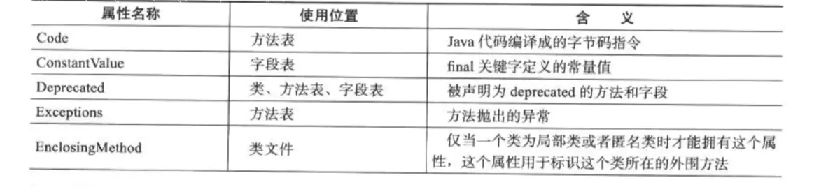 不再要求各个属性具有严格顺序,只要不与已有属性名重复,任何人实现的编译器都可以向属性表中写入字节定义的属性信息,Java虚拟机会忽略掉它不认识的属性。预定义属性已20多项如下表: