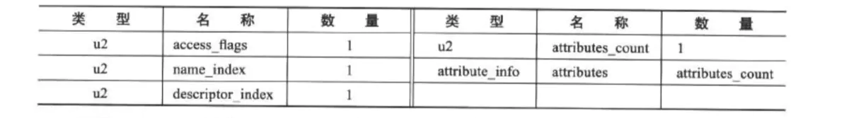 两个属性都属于标志类型的布尔属性,Deprecated用于表示某个类、字段或方法,被程序作者定为不推荐使用;Synthetic代表此字段或者方法并不是由Java源码直接产生的。他们的结构表如下: