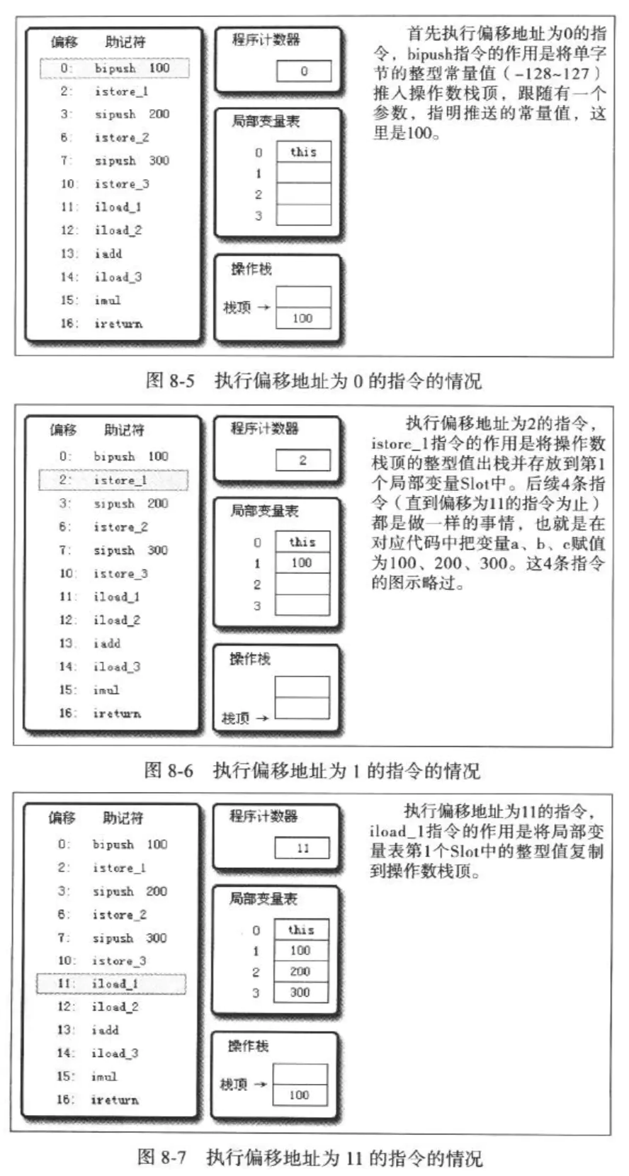 从上面的字节码指令中可以分析到:calc() 方法需要深度为 2 的操作数栈和 4 个 Slot 的局部变量空间,如下 7 张图描述上述代码执行过程中的代码、操作数栈和局部变量表的变化情况