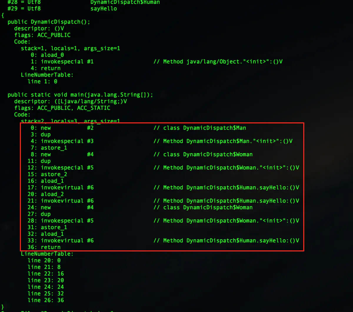 上面的输出结果不会出乎人的预料,从之前的静态分派中,我们可以指定,在这个例子中,不是根据对象的静态类型判断的,而是根据对象的实际类型判断的,那在 Java 虚拟机中是如何根据实例类型来判断的呢?我们使用 javap 命令得到上面 main() 方法的字节码如下所示: