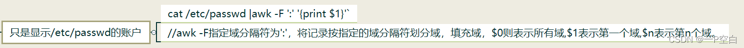 //awk -F指定域分隔符为':',将记录按指定的域分隔符划分域,填充域,$0则表示所有域,$1表示第一个域,$n表示第n个域。