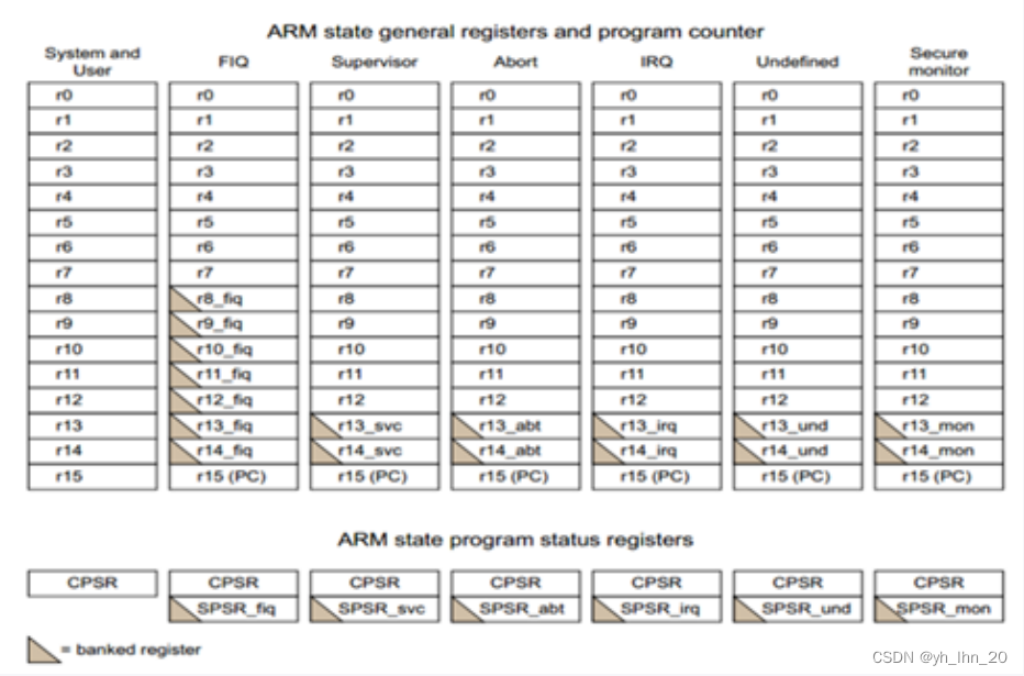 在ARM体系结构下,ARM架构提供37个32-bits的寄存器,布置在不同的组中,由当前所处模式决定哪一组被操作。在任何一种模式下内核都能进行存取。