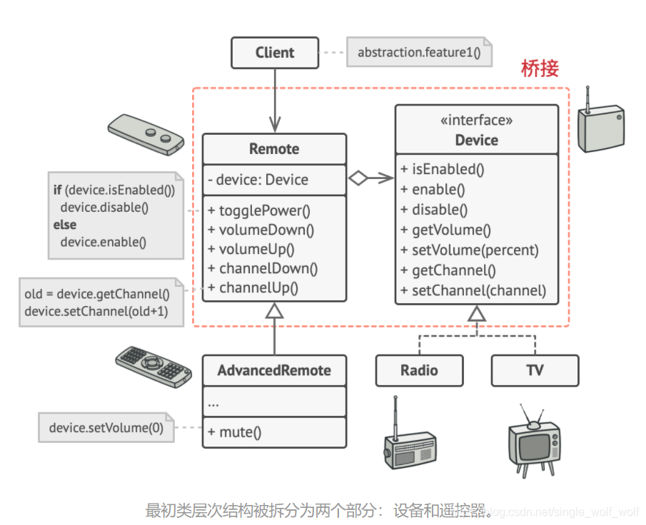 客户端代码通过遥控器构造函数将特定种类的遥控器与设备对象连接起来。