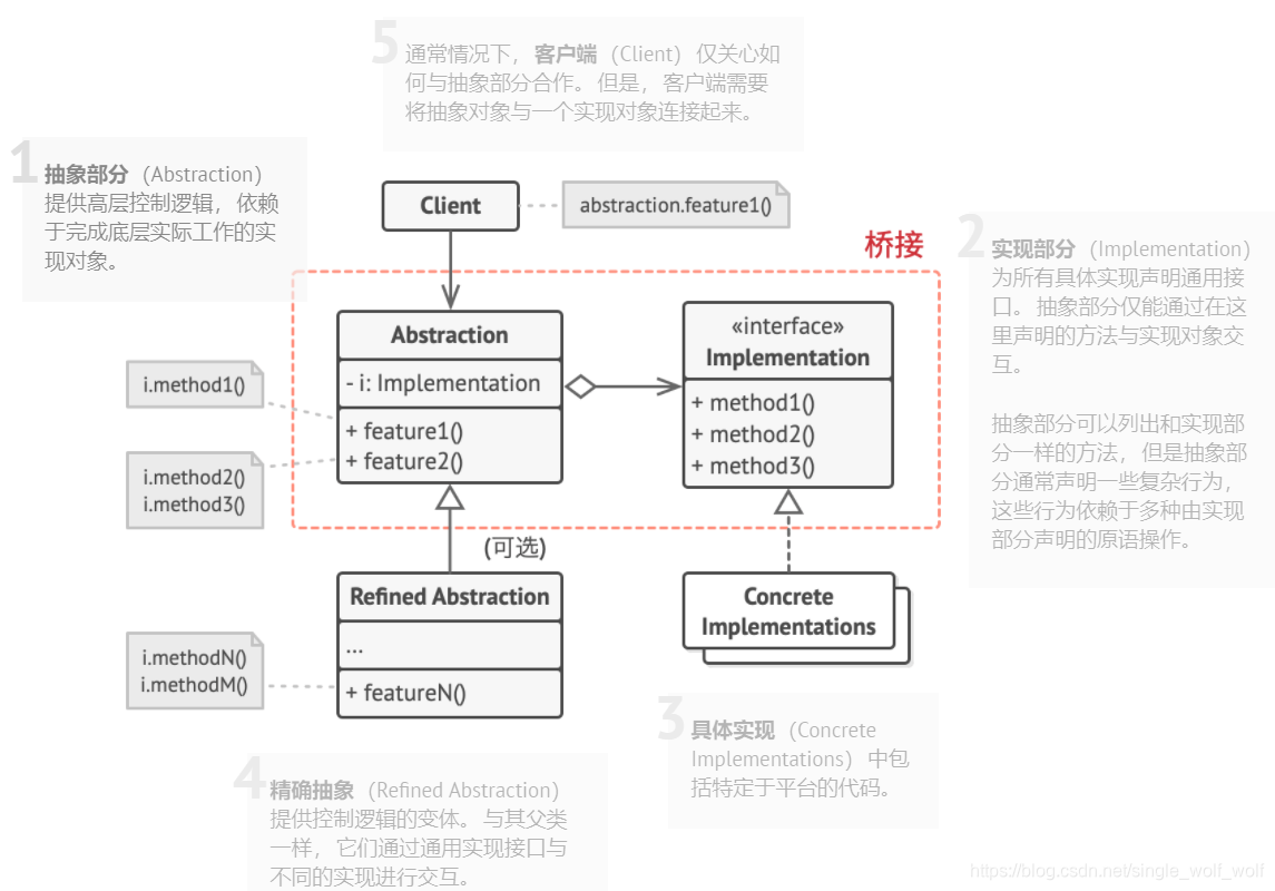4.精确抽象(Refined Abstraction) 提供控制逻辑的变体。 与其父类一样, 它们通过通用实现接口与不同的实现进行交互。