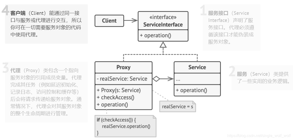 1.服务接口(Service Interface) 声明了服务接口。 代理必须遵循该接口才能伪装成服务对象。