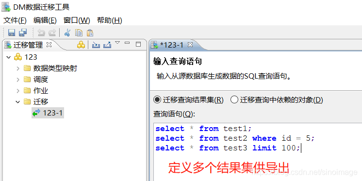 4、选择使用查询语句做为数据来源,可以非常灵活的定义需要导出的数据内容,相较于其他数据库自带的导出工具,DM的显得更加灵活。