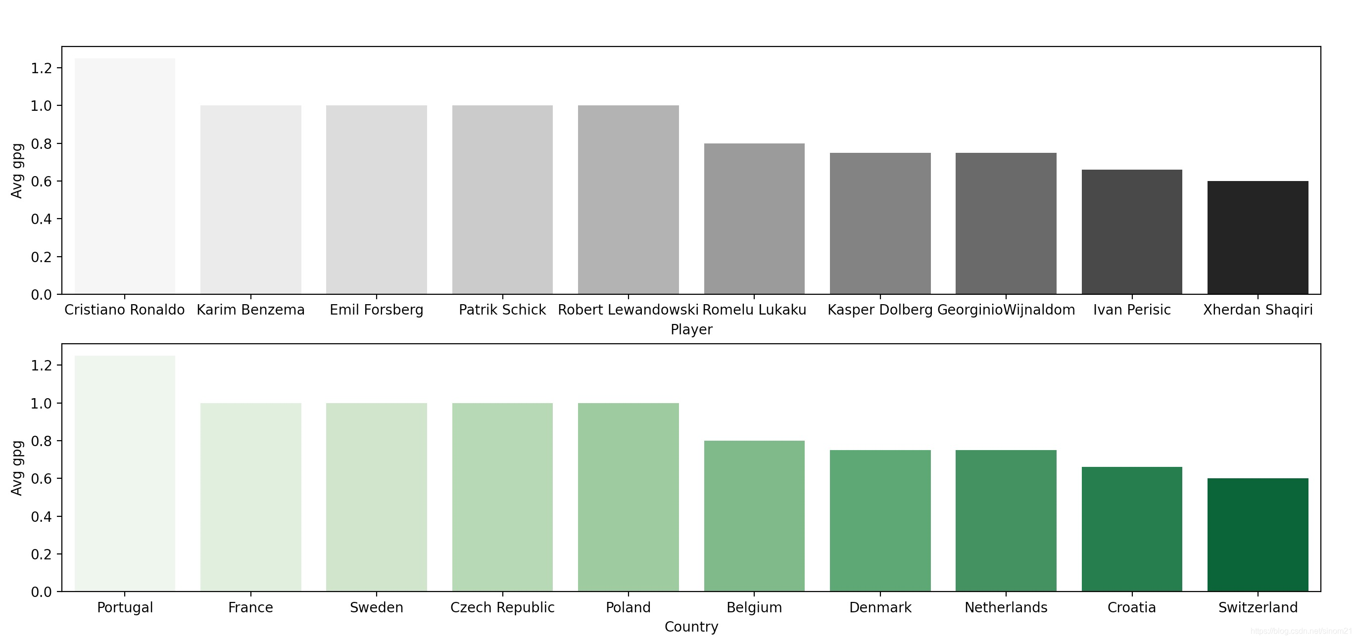 sns.barplot(x = "Player", data = agp, y = "Avg gpg", palette = "Greys", ax = ax[0])