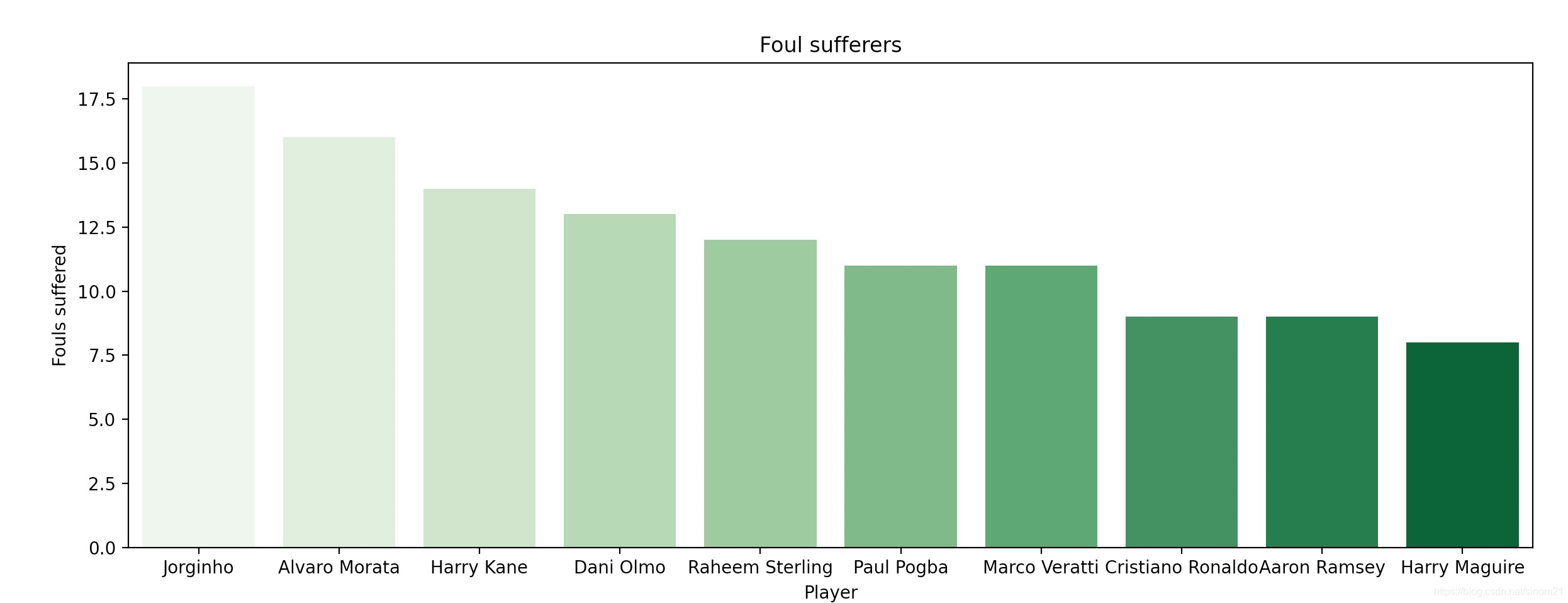 sns.barplot(x = "Player", data = Foulers, y = "Fouls suffered", palette = "Greens")
