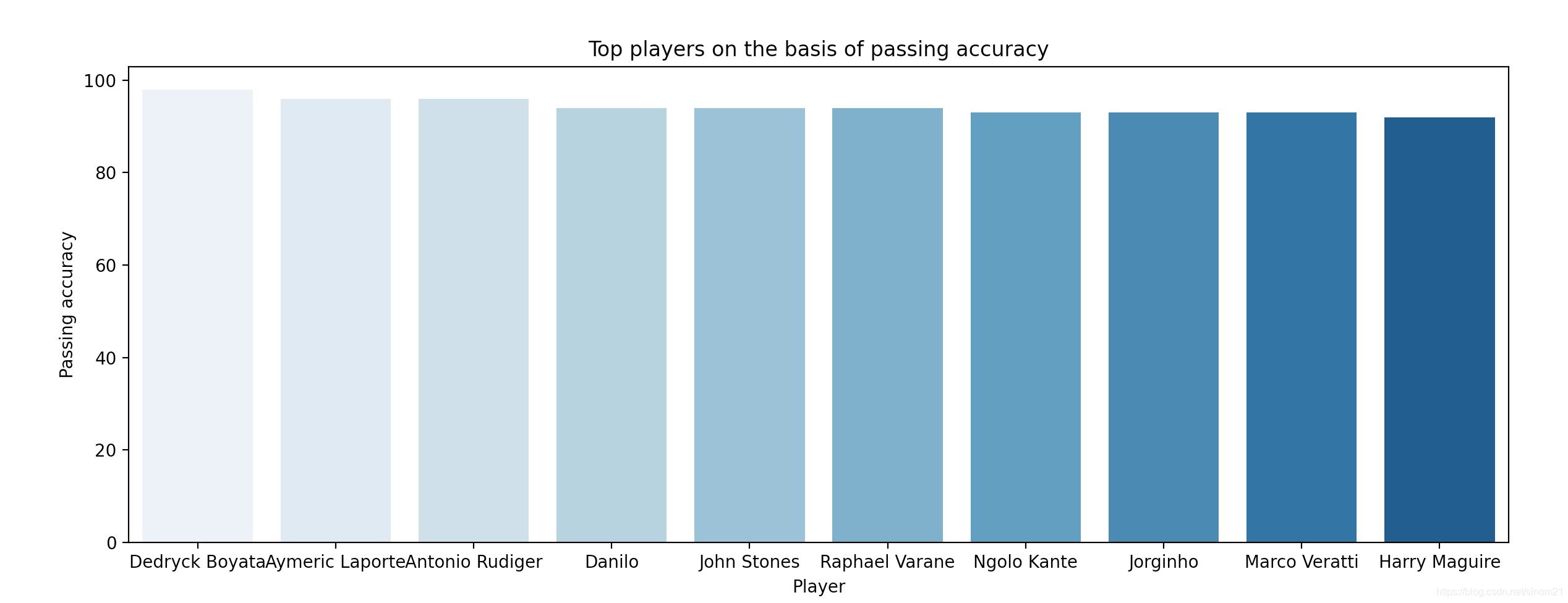 sns.barplot(x = "Player", data = passing_accuracy, y = "Passing accuracy", palette = "Blues")