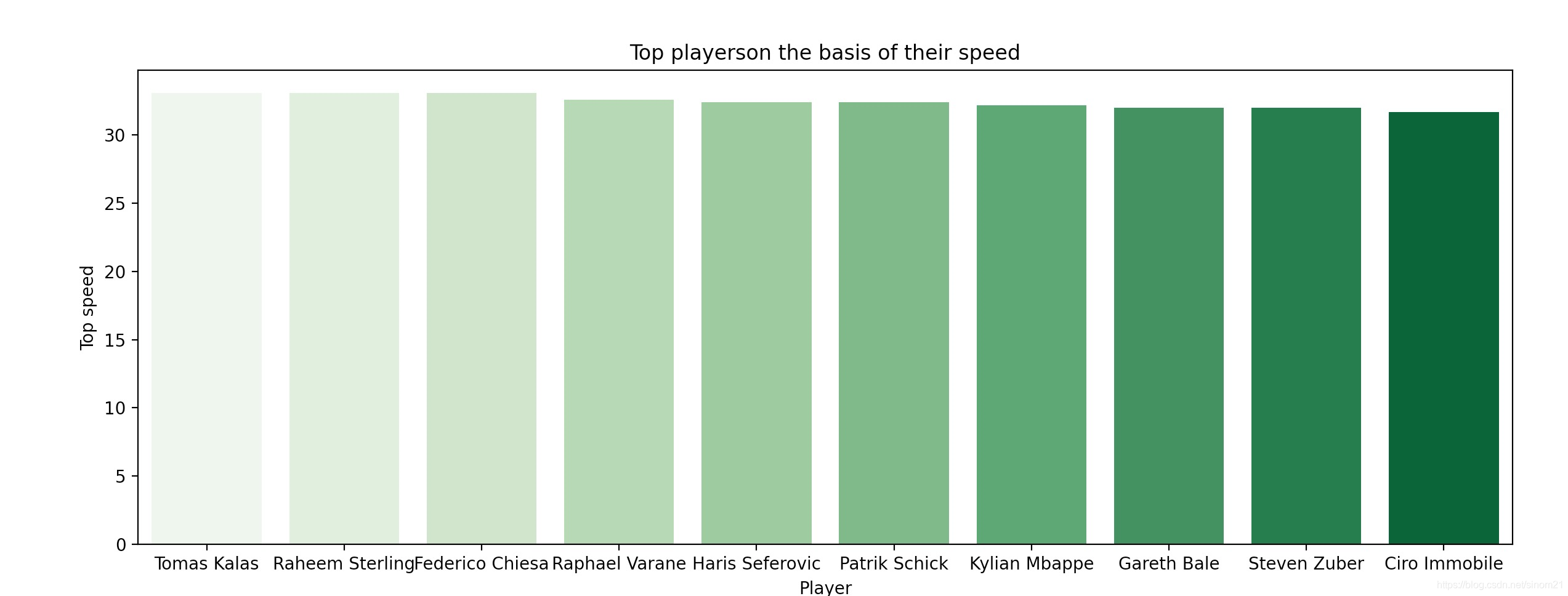 sns.barplot(x = "Player", data = speedy, y = "Top speed", palette = "Greens")