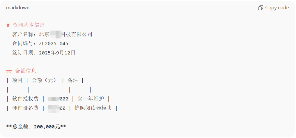 当OCR识别一份扫描的合同或表格时,系统可以直接输出如下Markdown结果: