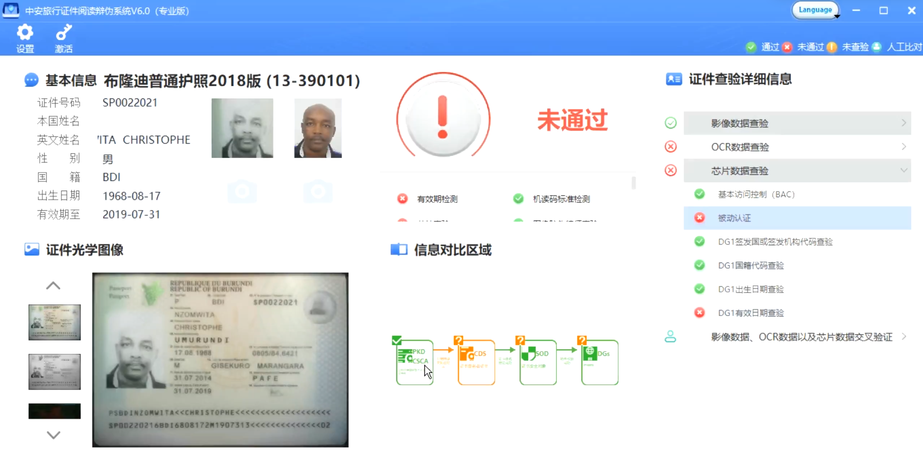 安全特征检测(影像数据查验、OCR数据查验、芯片数据查验、OCR数据与电子芯片内容交叉验证);