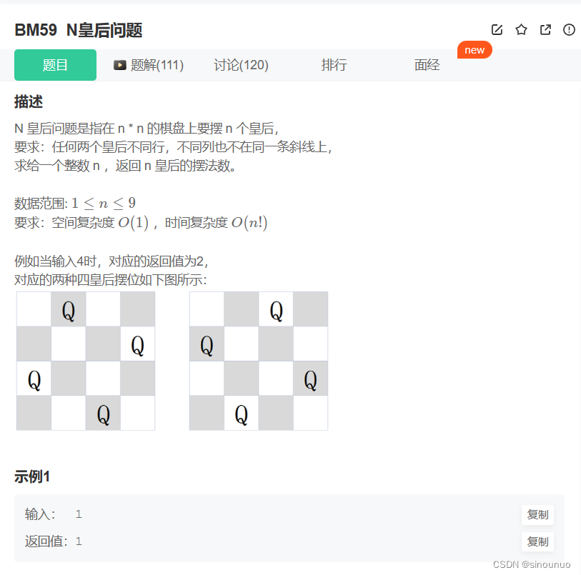 思路:每一行每一列都需要放入一个皇后,我们可以递归行号,然后在该行内,找列可以放的位置,如果都不冲突,就可以放入。然后记录列号,继续递归。需要用一个col[]记录每一行放入了哪一列。