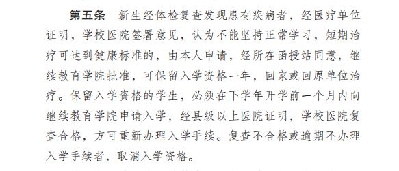 2022年被录取的成考考生如果在入学体检中,发现个人身体素质不达标,患有重大疾病,那院校就会暂时保留这部分新生的入学资格。待到这部分新生的身体恢复健康状态后,再为其办理入学手续。当然保留入学资格的前提是,这部分成考新生可以在之后的一年时间内,治疗好身体。如果达不到这一要求,那这部分新生就无法通过入学资格复查,这种情况下院校就会按规定取消其入学资格。