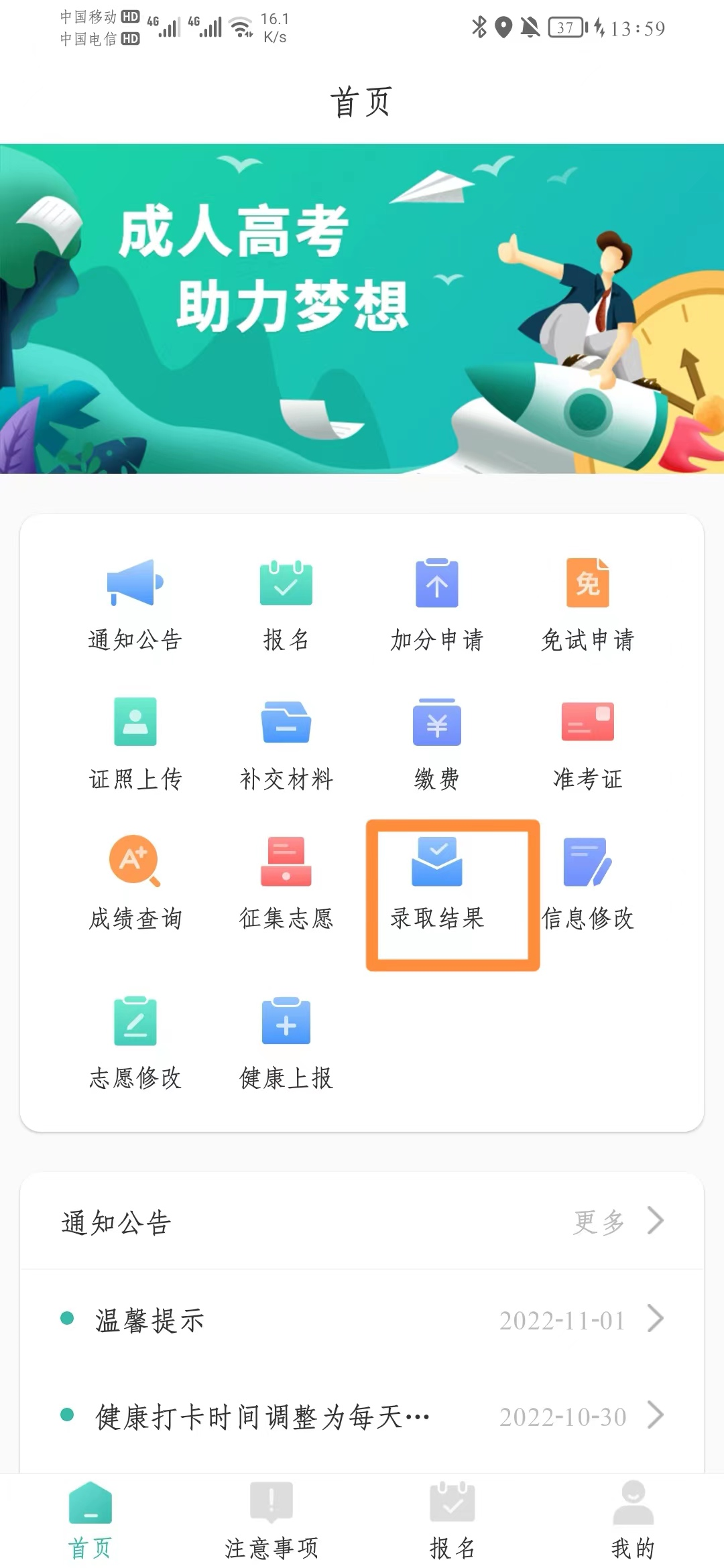 1、考生登录“潇湘成招”app,进入首页后点击“录取结果”字样