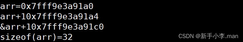 arr与arr+1之间相差了4个字节,arr的地址也就是arr[0]的地址,我们定义的是int类型的数组,相差4个字节就意味arr+1等价于arr[1] ,没有问题。再看&arr+1,发现打印的地址,和首地址相差了32个字节,刚好是sizeof(arr)这个数组的长度,那我们就得知&arr再进行加1会跨越一整个数组。