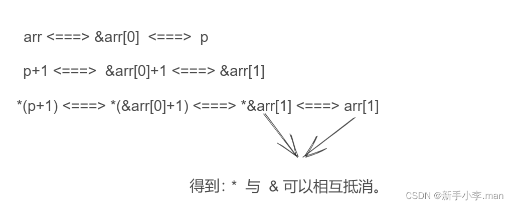p存放的是数组首元素的地址,即p等价于&arr[0],p+1代表的就是&arr[0]+1, 在之前那个例子中得到的结论是&arr+1代表是地址加32,那现在是&arr[0]+1,代表的便是地址+4,对应的也就是&arr[1],所以p+1等价于&arr[1],再加上解引用,就是指向地址所对应的值了。下面是一个等式帮助理解: