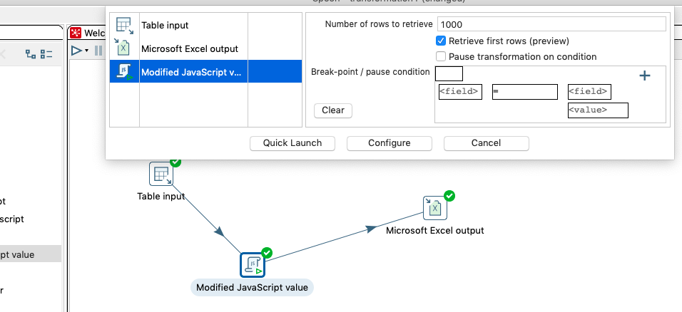 以上只是演示了数据转换中最基础的几个功能,其他更详细的功能都可以在Design tab中找到 总的来说 kettle的操作逻辑就是 steps + hops,step是你的操作步骤,hops就是链接。