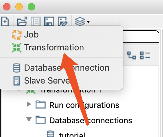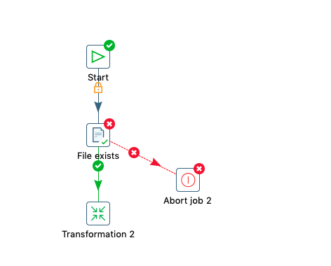 以上只是演示了数据转换中最基础的几个功能,其他更详细的功能都可以在Design tab中找到 总的来说 kettle的操作逻辑就是 steps + hops,step是你的操作步骤,hops就是链接。 作业 JOB上面只介绍了kettle的核心功能之一转换,现在要介绍kettle的另一个功能job。 作业其实就是一个自动化流程,当你需要进行多个转换或者要增加一些逻辑控制条件的情况下,就需要job来实现。 这里就根据前面hello world的例子,实现一个简单的job,检测当文件夹内不存在file的时候,就自动从数据库中导出数据并添加hello。