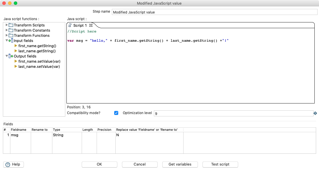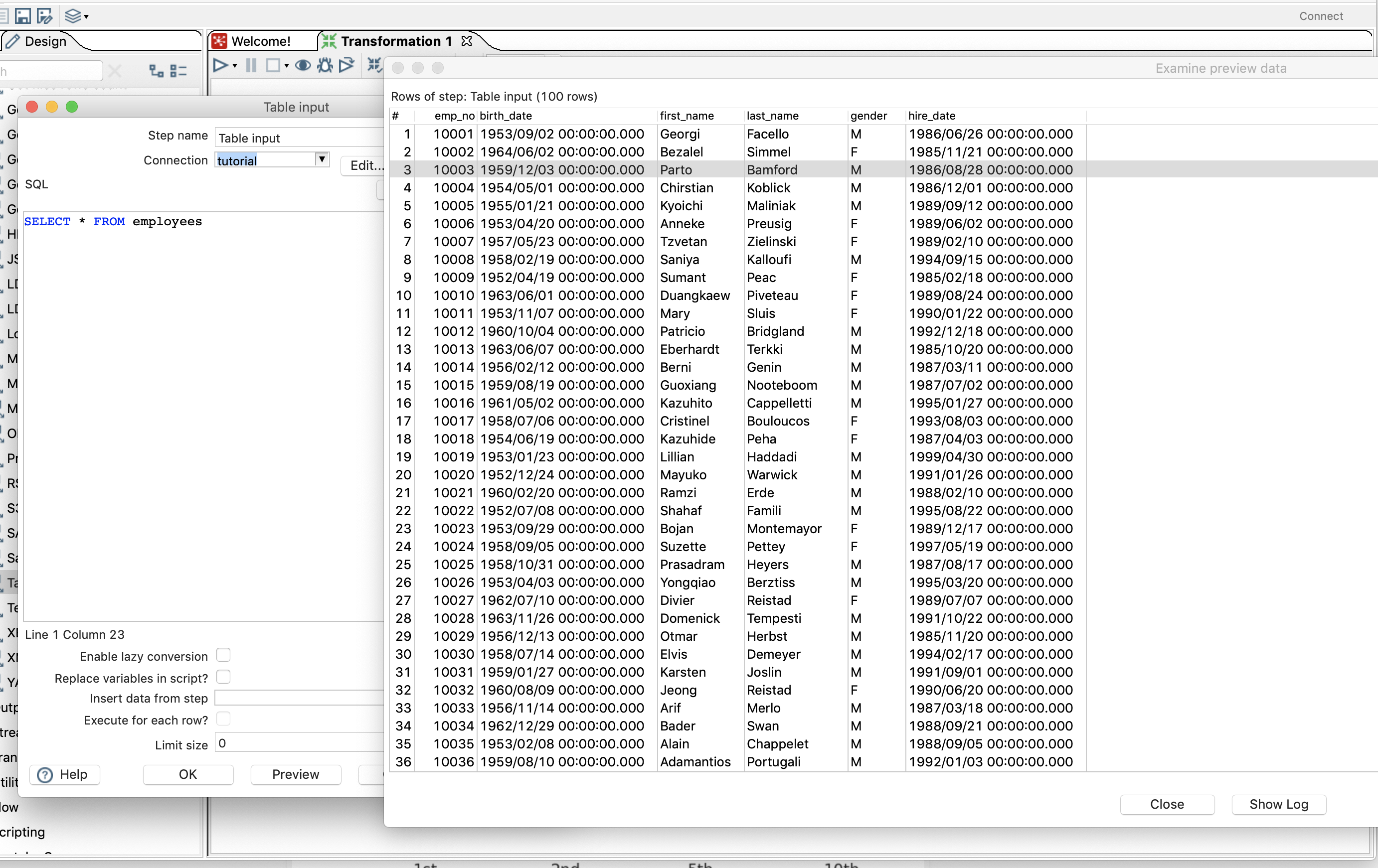 Hello World好,现在你已经学会了转换,下面我们就来个Helloword实例,这个教程是我在网上看到的,觉得还不错,可以多接触kettle的一些功能,而不像我上面的非常基础。 那么这个helloworld就是针对数据库中的每个人名输出对应的gretting并导出为文件。 首先同理设置输入源,但SQL语句需要修改下,我这里是只选出了他们的名字,按id排列,取前十个。 然后就是写个js脚本自动添加个hello