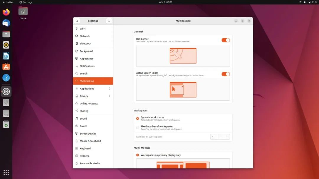 在系统设置应用中可以获得大量的多任务选项。在这里,你可以选择是否使用 dynamic workspaces(按需创建)或坚持 fixed number。你可以禁用触发 workspace switcher 的 hot corner;并选择禁用窗口捕捉功能。