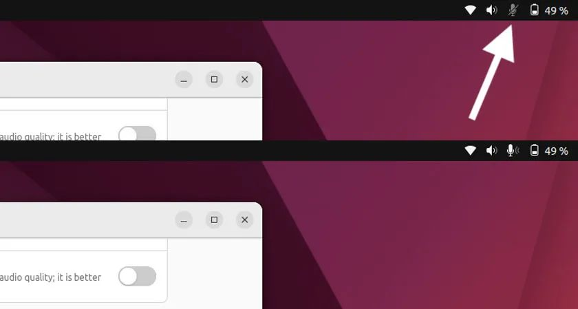 Ubuntu 22.04(从技术上讲是 GNOME 42)有一个很方便的帮助:当呼叫处于激活状态时,你的麦克风状态会显示在顶部的栏中。当你的麦克风处于静音状态时,你会看到一个灰色的图案,让你知道没有人能听到你的声音。