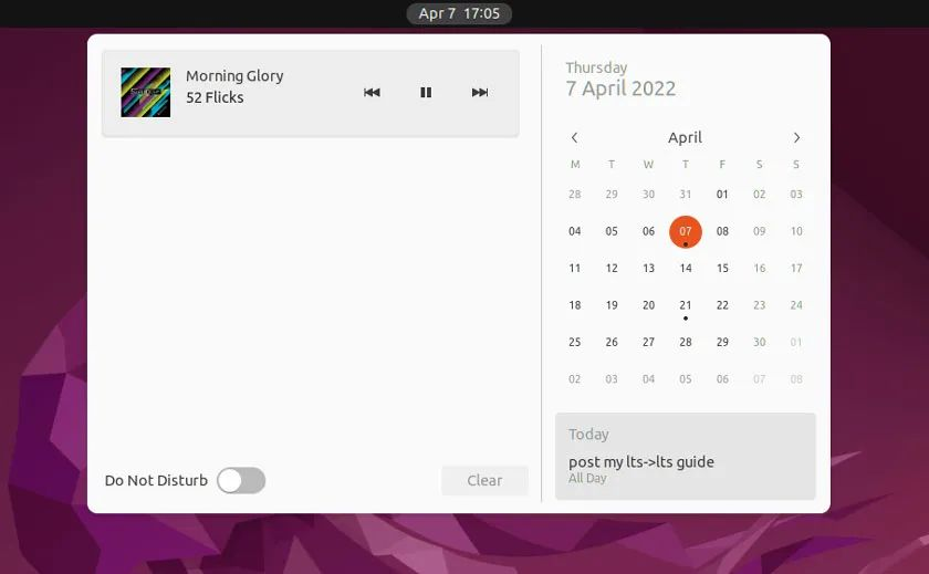 来自日历应用程序的事件出现在通知 shade/clock applet 中。默认情况下,你会看到当天的所有事件,但你可以在日历中选择一个日期来查看其他日子的事件。如果当天有活动安排,下面会有一个小 "点" 图标,然后在日历下面的卡片中预览该事件。