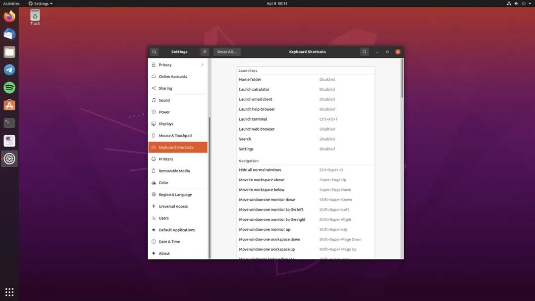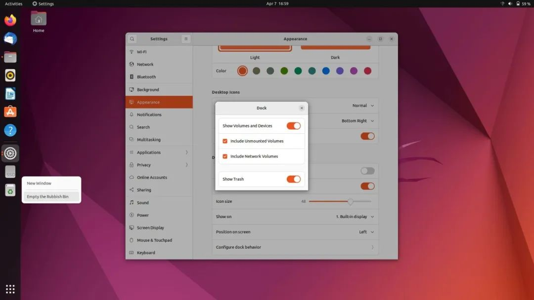 对 Ubuntu Dock 进行了一些调整。trash can item 现在位于 Dock 中而不是桌面上,同时一个新的分隔符将 running app icons 与 pinned app icons 分开。