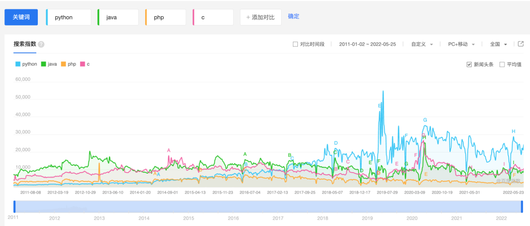 几种主流语言十年来的搜索指数变化