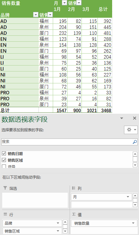 2)求出不同品牌下,每个地区、每个月份的销售数量之和