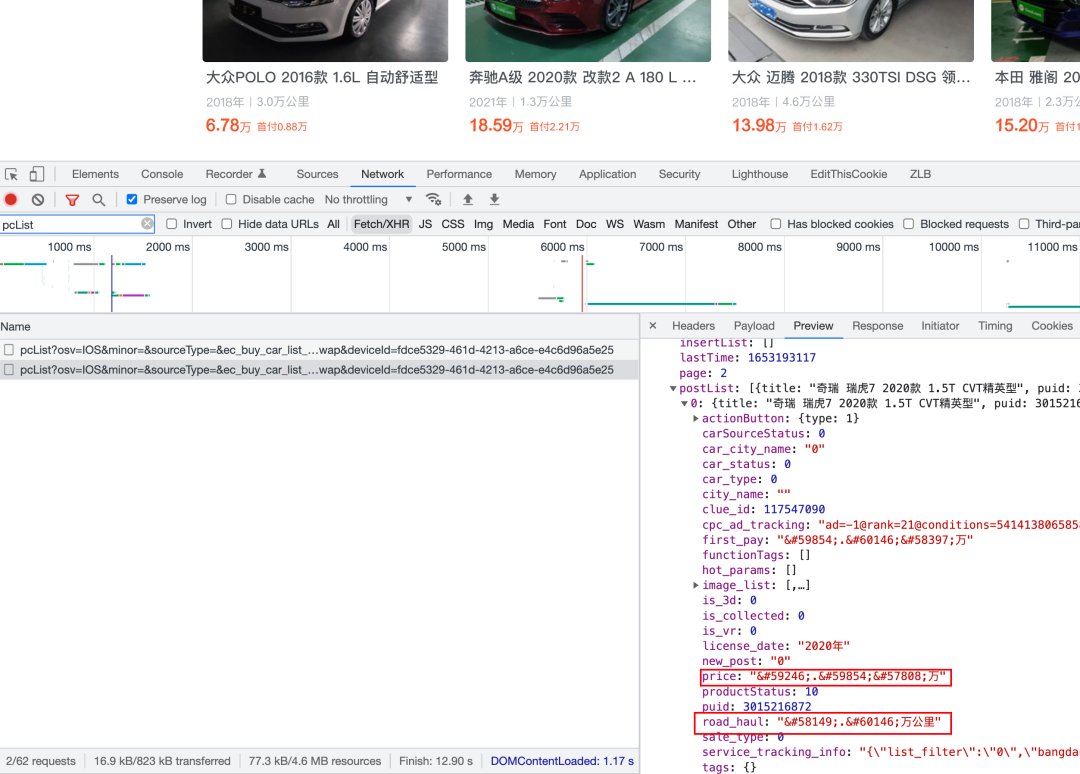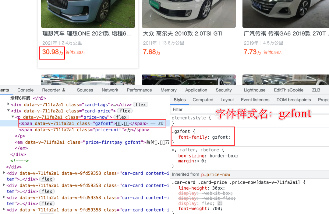 打开目标页面及浏览器的开发者工具栏,我们发现汽车价格、首付金额、公里数中的部分内容在源码中显示为乱码,但在界面中展示正常