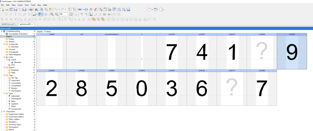 在浏览器的新窗口中,通过字体 URL 下载字体文件,然后在 PC 上使用软件 FontCreator 打开查看