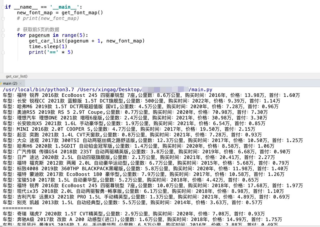 print(f'车型:{title},公里数:{road_haul},购买时间:{license_date},价格:{price},首付:{first_pay}')