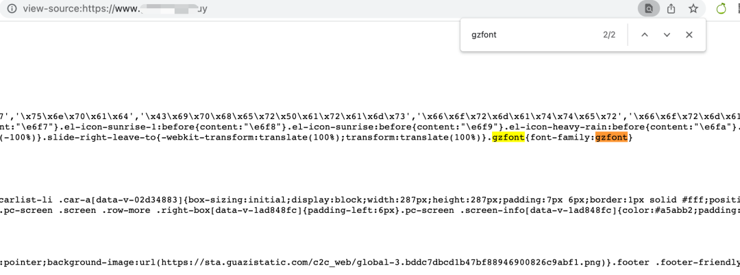 我们在网页源码中通过关键字「 gzfont 」尝试查找字体的实际 URL 地址