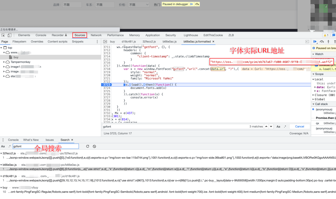 通过新增一个断点,找到 gzfont 字段生成的逻辑及字体 URL 地址
