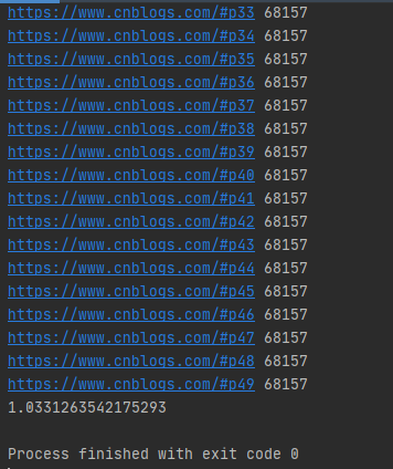 import requestsimport concurrent.futuresimport timeurls=[ f'https://www.cnblogs.com/#p{page}' for page in range(1,50)]def get_parse(url): response=requests.get(url) return response.textdef map_pool(): with concurrent.futures.ThreadPoolExecutor(max_workers=20) as pool: htmls=pool.map(get_parse,urls) htmls=list(zip(urls,htmls)) for url,html in htmls: print(url,len(html))if __name__ == '__main__': t1=time.time() map_pool() t2=time.time() print(t2-t1)