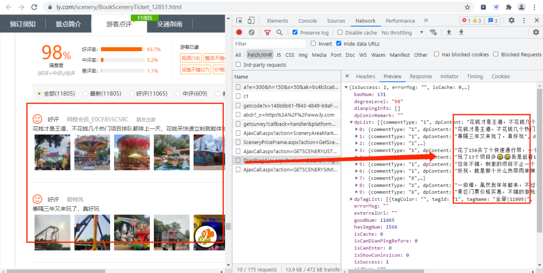通过上面的URL链接,我们可以获取到很多景点的基础信息,随机打开一个景点的详情网页并打开开发者模式,经过查找,评论数据存放在如下图的URL链接中,