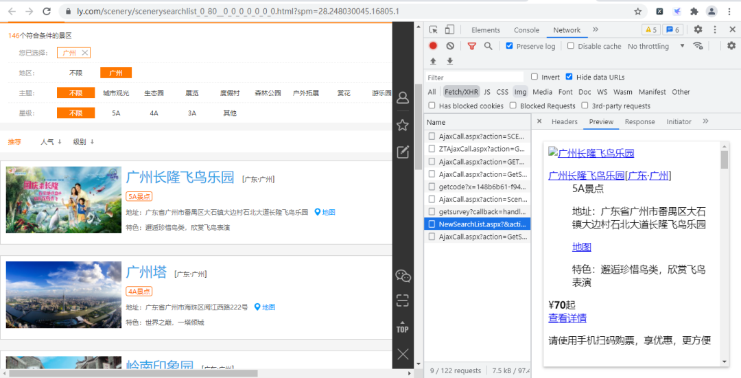 首先我们进入同程旅行的景点网页并打开开发者工具,如下图所示: