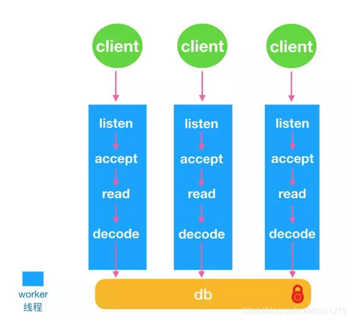 KeyDB将redis原来的主线程拆分成了主线程和worker线程。每个worker线程都是io线程,负责监听端口,accept请求,读取数据和解析协议。如图所示: