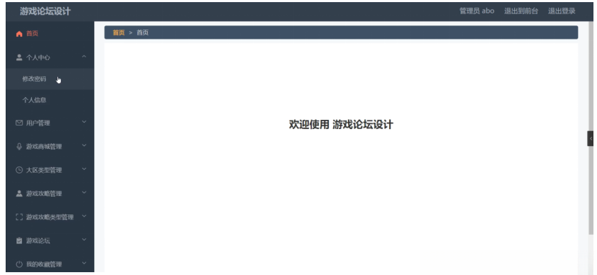 管理员登录进入游戏论坛设计可以查看首页、个人中心、用户管理、游戏商城管理、大区类型管理、游戏攻略管理、游戏攻略类型管理、游戏论坛、我的收藏管理、试卷管理、管理员管理、留言板管理、试题管理、系统管理、订单管理、考试管理等信息,如图5-10所示。